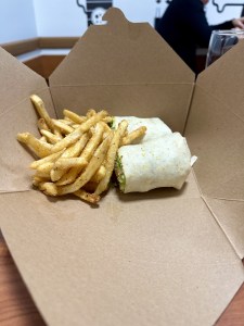 The presentation is a brown box of warm fries and a room temperature wrap. The wrap is probably meant to be room temperature and the fries are warm enough to barely pass.
