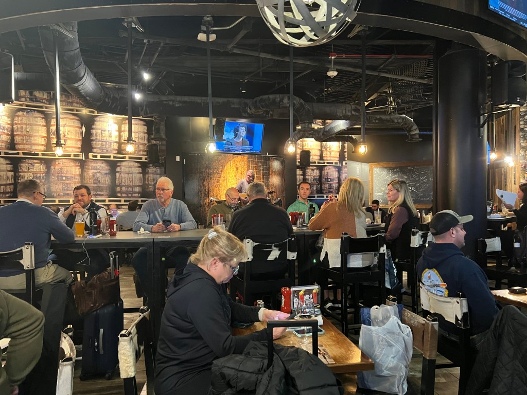 Time to eat. And drink. We can’t wander on account of the dubiously short turnaround. There is no establishment that will serve both dinner AND drinks. Then, like a beacon: Whisky River. The line is moving quickly, there is live music, I see both food and beverages on tables, and it’s close enough to the gate that we can periodically send a delegate to get eyes on the departure status. Sold. We are seated with the angry strangers at the aforementioned community table. Whatever.