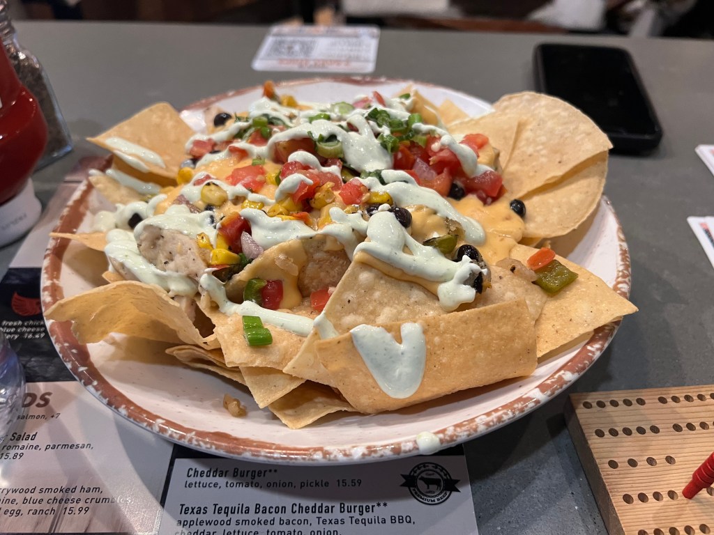 I flag down a waitress and order a drink. She intuitively confirms, “you want a double, right?” Of course I do. A quadruple sounds like too much, but I’d have said yes if she’d asked. The menu lacks inspiration, and I’m so hungry that nothing sounds good. I give up and order nachos, it’s hard to ruin a nacho, and they usually come out quickly. Again, whatever.